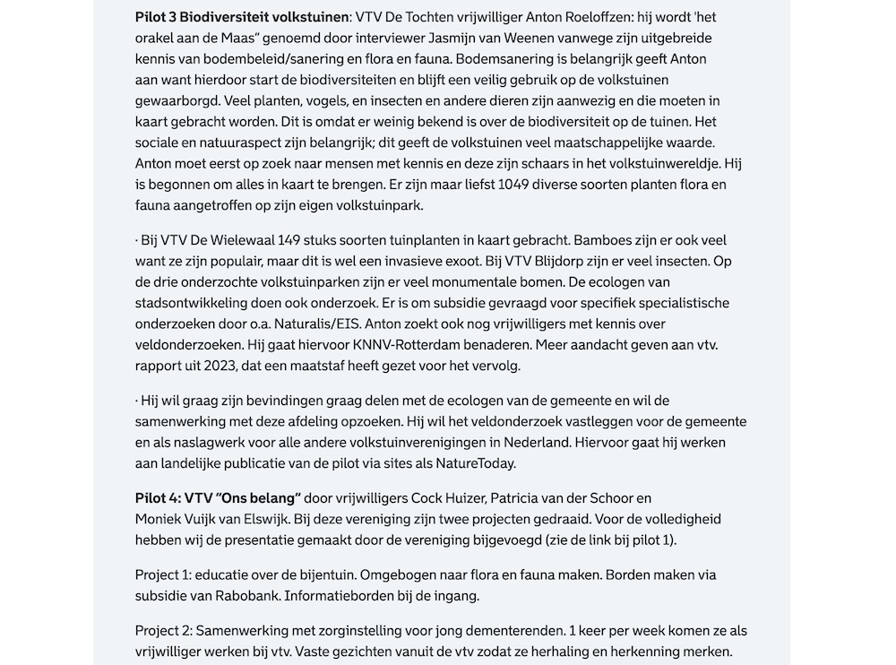 In de nieuwe volkstuinvisie staat dat volkstuinen ‘intensief en inclusief’ moeten zijn/worden. Daarop moet gestuurd worden. Maar hoe ziet dat er uit in de praktijk? In oktober 2024 zijn er door de gemeente vijf pilots toegekend om te testen hoe volkstuinverenigingen de wijk beter zouden kunnen betrekken bij volkstuinen. De pilots zouden richting kunnen geven aan beleid van de gemeente omtrent volkstuinen.