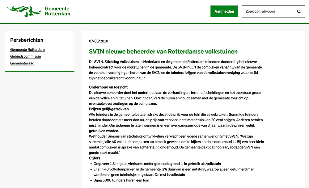 Vanaf 2018 int de nieuwe opgerichte Stichting Volkstuinen in Nederland de huurpenningen en coördineert het onderhoud op de volkstuincomplexen. Met een klein team dat een flinke taak heeft wordt getracht deze taak goed uit te voeren.