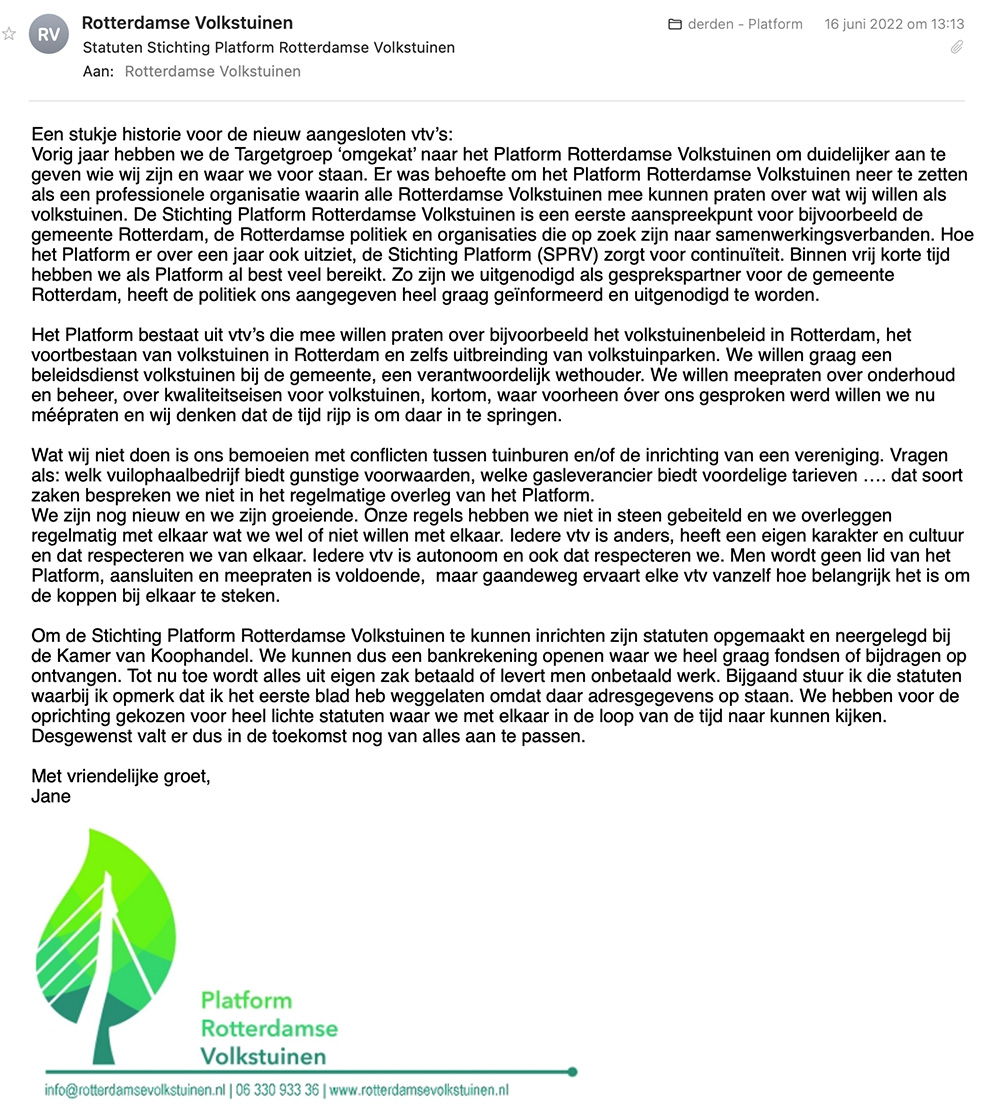 In 2022 groeit het Platform Rotterdamse Volkstuinen gestaag. Steeds meer volkstuinverenigingen sluiten zich aan, zich bewust van de kracht van gezamenlijk een vuist maken, samen sterk staan en de uitdagingen die de volkstuinen te wachten staan, het hoofd te bieden. Niemand wil een herhaling van de RBvV. Het Platform is daarom zo laagdrempelig mogelijk.