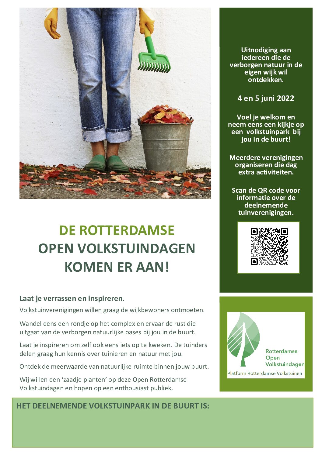 Het Platform Rotterdamse Volkstuinen realiseert zich maar al te goed dat er gewerkt moet worden aan de reputatie van de volkstuinen bij het publiek en vooral bij de gemeente. Daarom worden op 4 & 5 juni 2022 de eerste Rotterdamse Open Volkstuindagen georganiseerd.